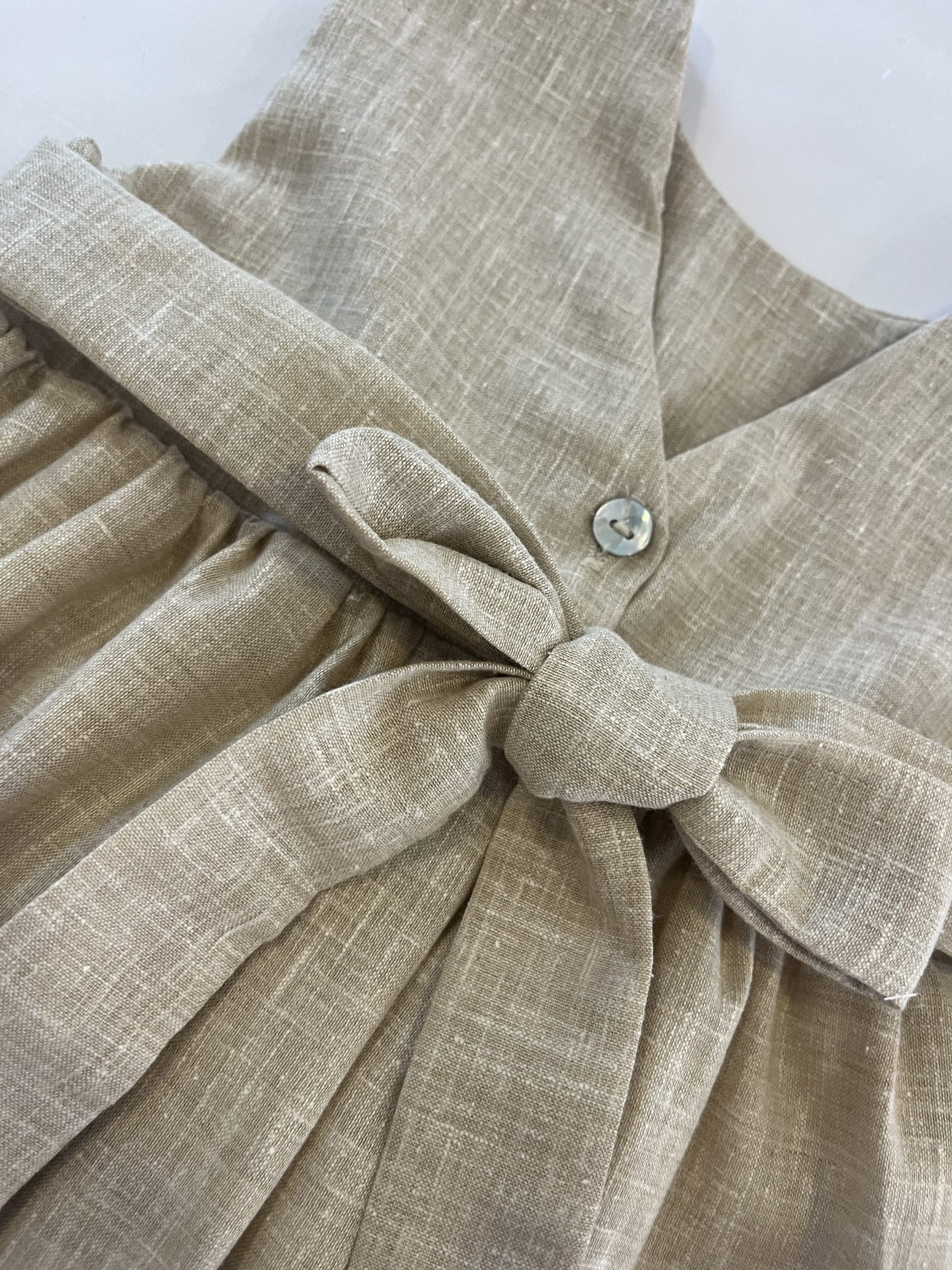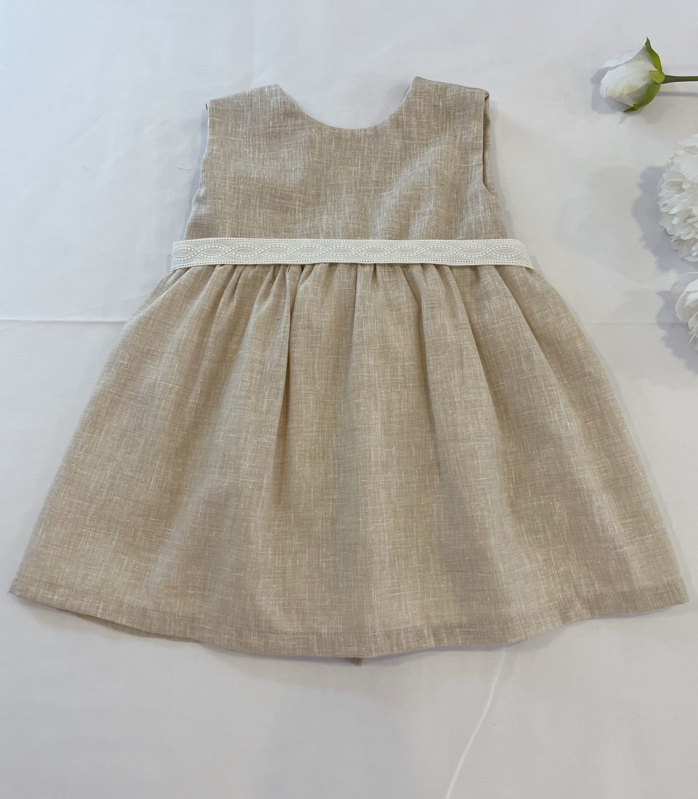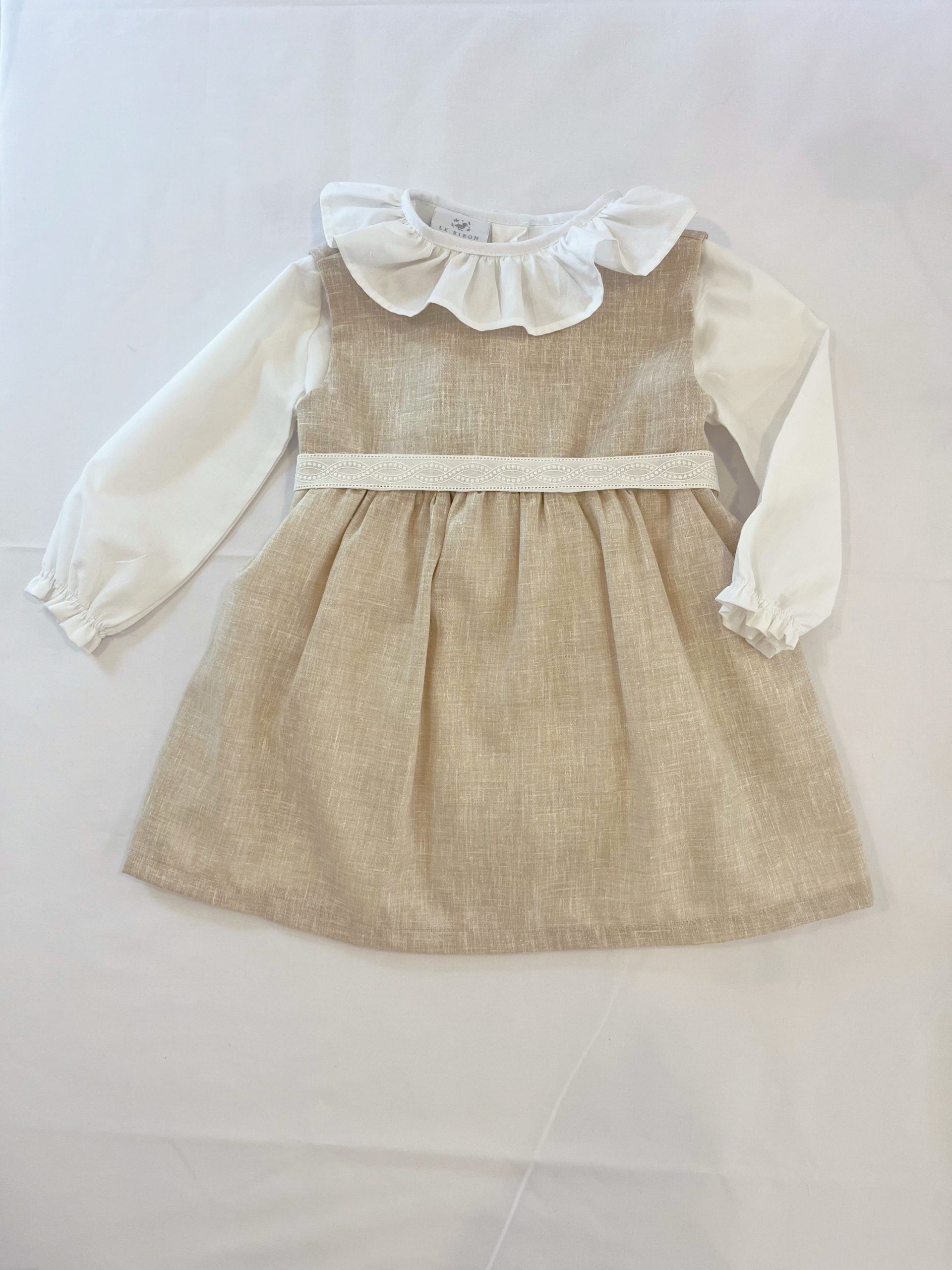 El vestido Emilia lleva tira bordada al frente y botones de concha en espalda. Manga cizada